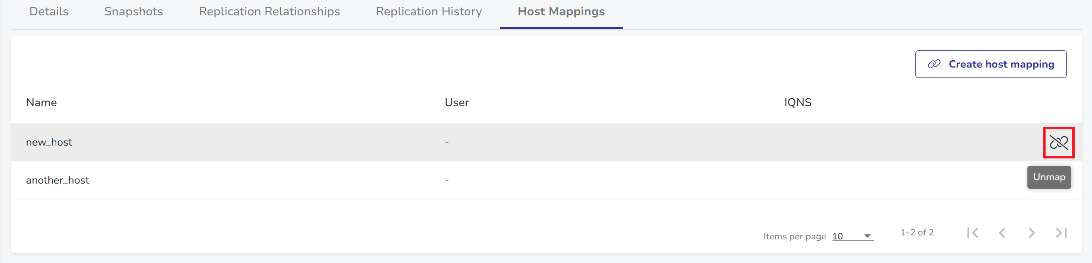 - Hover over the host mapping you want to delete and click Unmap.