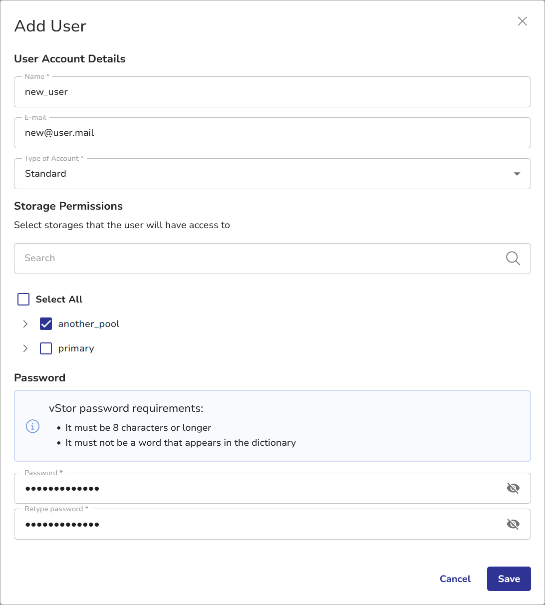 vStor implements an advanced permission model that lets you create and manage user accounts with role-based access control. This system defines permissions for both administrators and standard users, allowing controlled access to vStor resources.