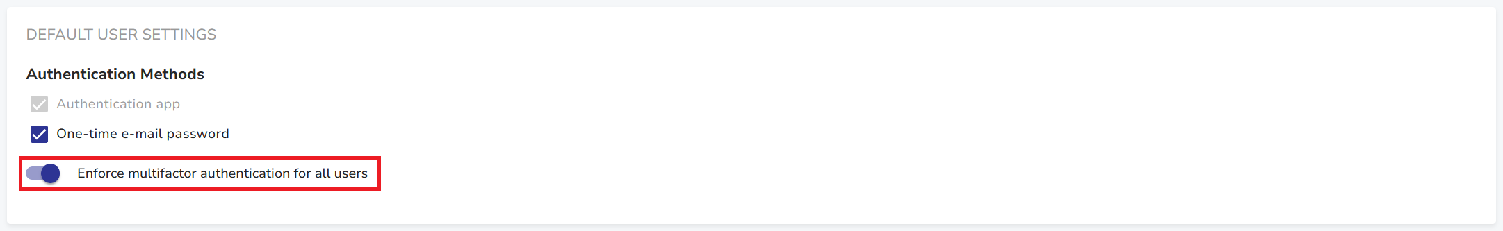 The administrator may also choose to allow or disallow authenticating via one-time e-mail password by unchecking the One-time e-mail password checkbox. Authenticating via an app cannot be disallowed.