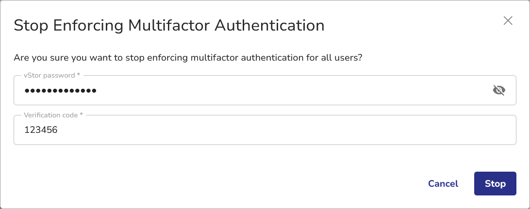 To stop enforcing multifactor authentication, switch the toggle off. You will be prompted to confirm your decision with your vStor password and an MFA verification code.