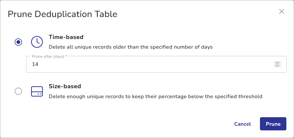 - Use Size-based pruning when controlling table growth is more important than retaining records for a specific duration.