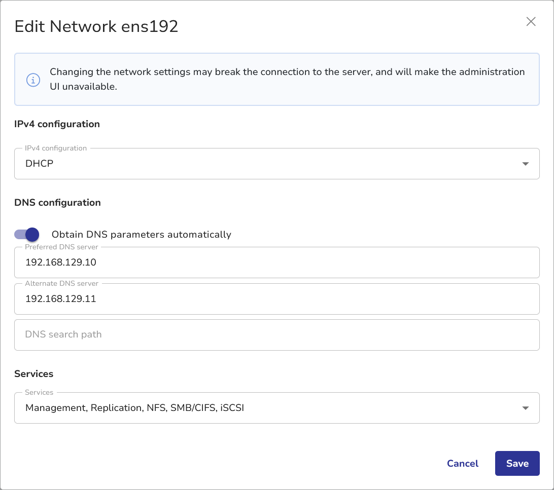 Run the vStor network update command to modify services associated with an interface, for example, if you’re using a dedicated interface for data traffic to improve performance: