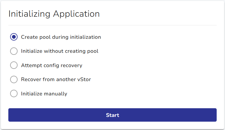• Initialize without creating pool: Initializes the server without creating a storage pool. The user will need to create a pool at a later stage.
