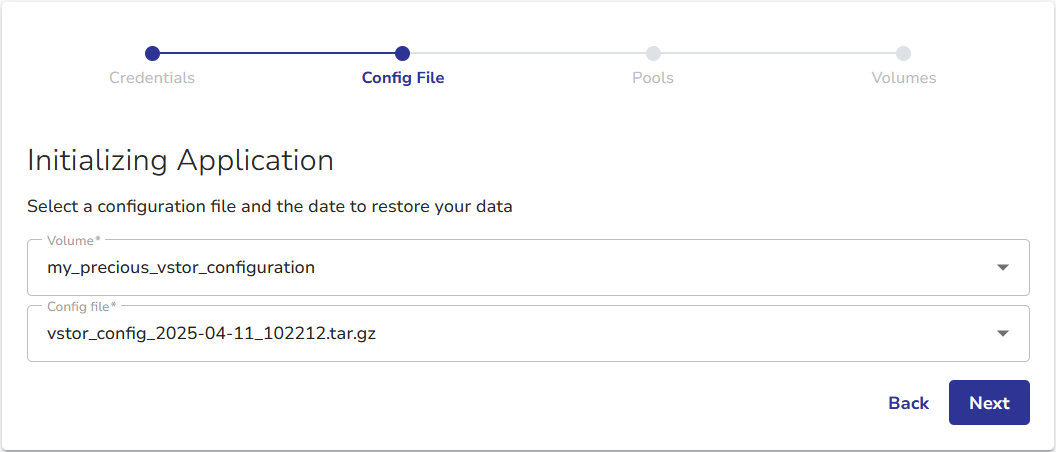 At this stage, the configuration file is already loaded. Therefore, log in with credentials valid for the vStor whose configuration you are restoring.