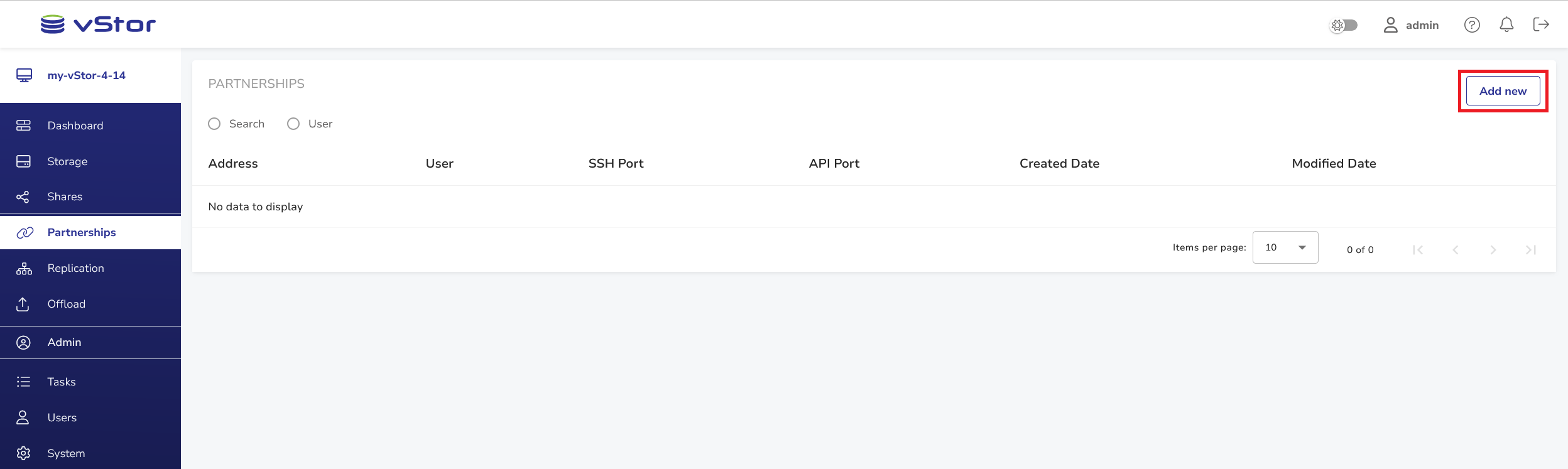 To create a new partnership using vStor CLI, use the following command, specifying the address, username, and password of the remote server: