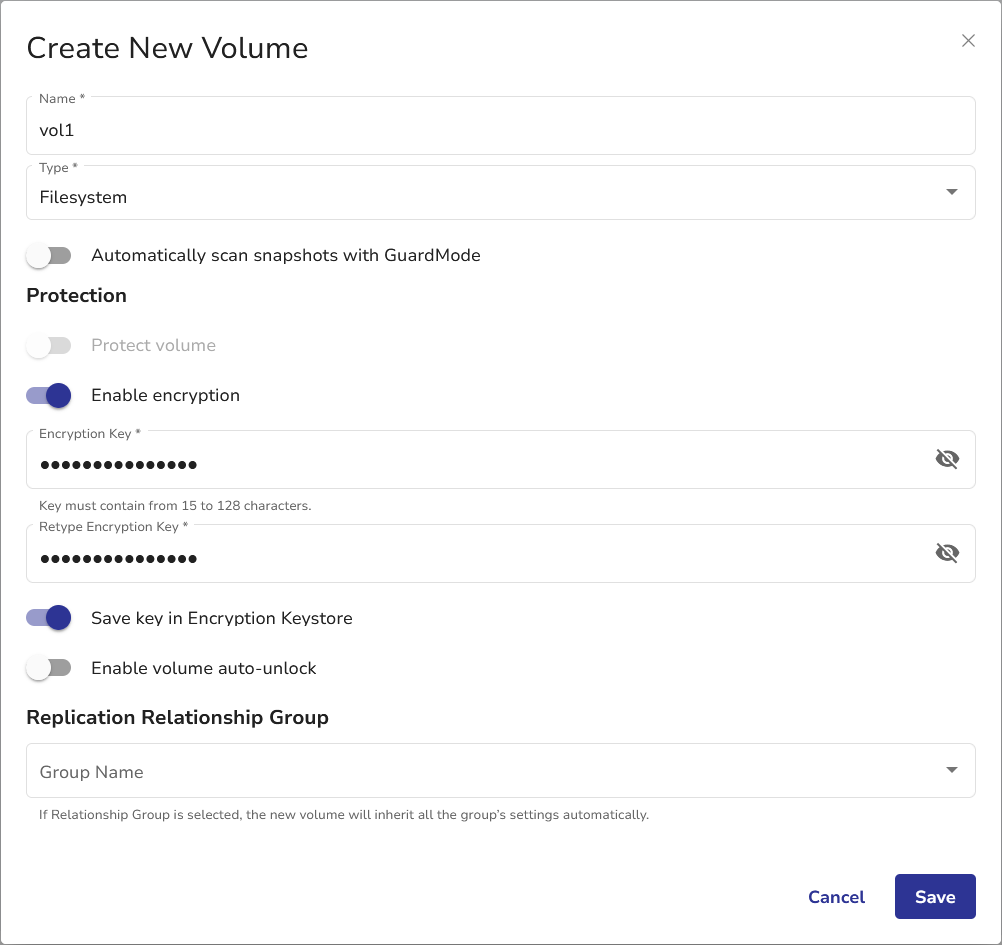 In Catalogic vStor, you can improve data security by enabling encryption for a volume during its creation. To do so, switch on the Enable encryption toggle and define an Encryption Key. The Key must be between 15 and 128 characters in length.