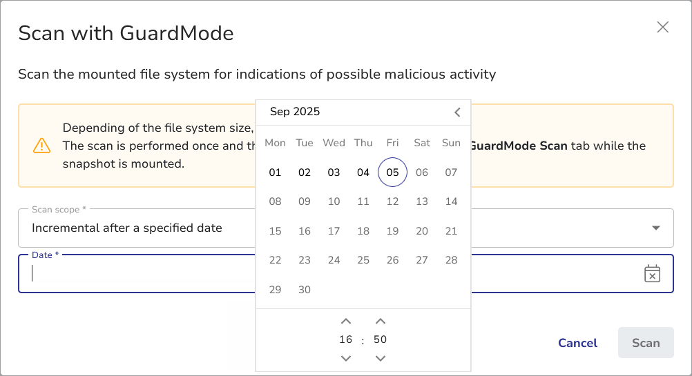 GuardMode Scan is a powerful feature that allows you to scan mounted filesystems for potential ransomware infections or malicious data encryption. This tool is particularly useful when you want to ensure the integrity of your data before restoring it to production environments.