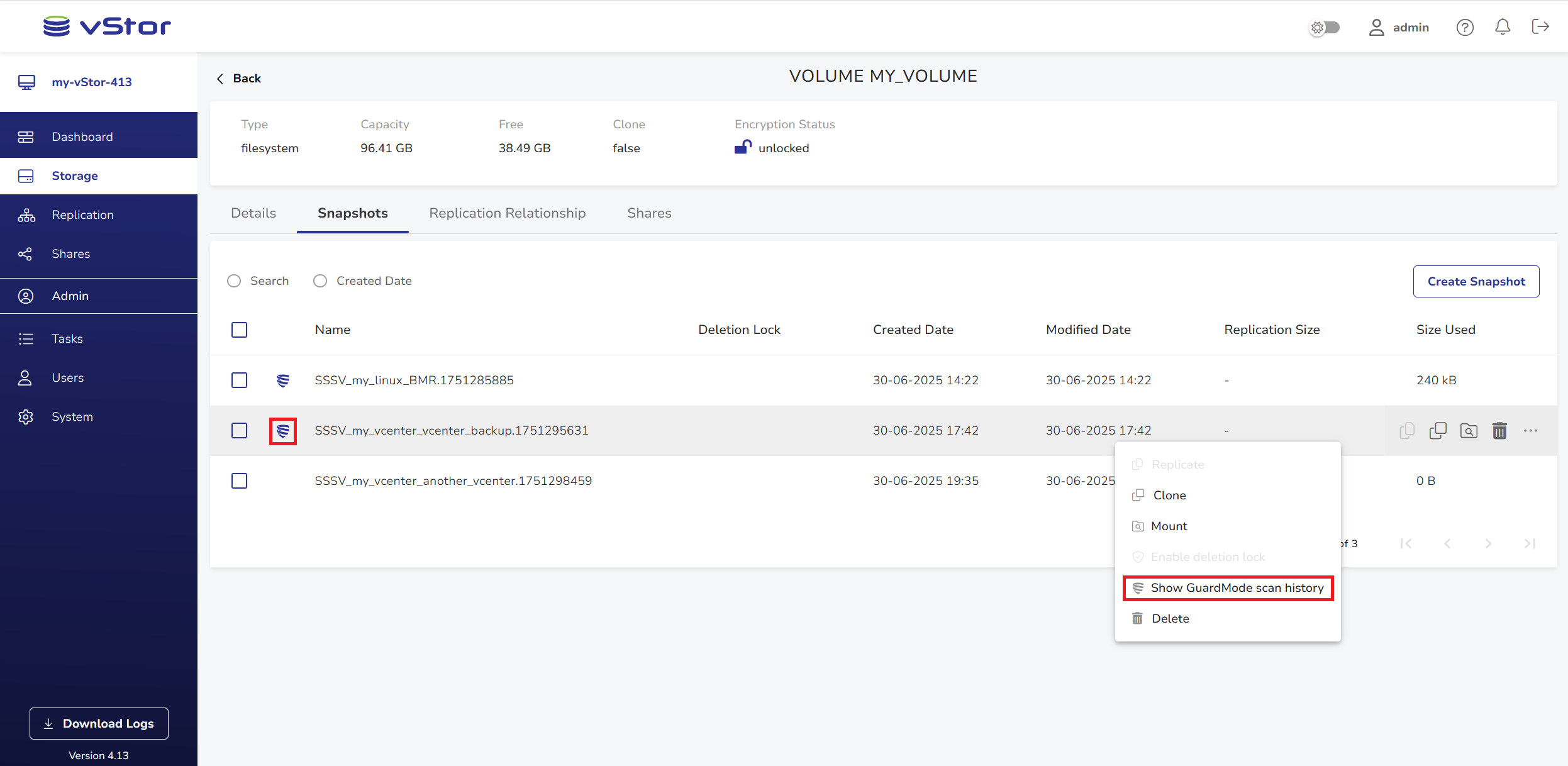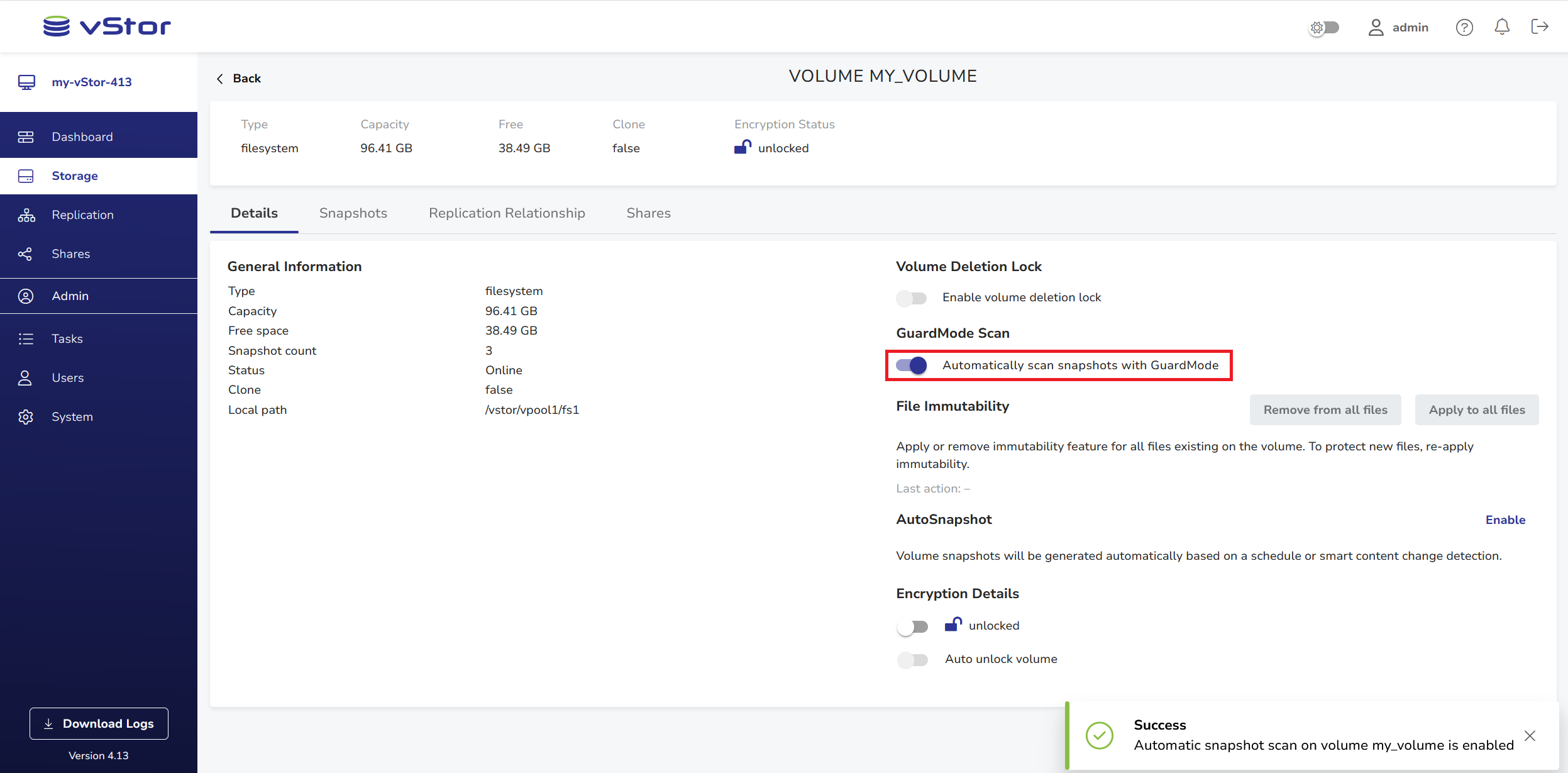 The automatic GuardMode scan feature is controlled at the volume level. It can be enabled or disabled by the admin user and any standard user with pool-wide privileges. When enabled, all newly created filesystem snapshots on the volume will be scanned automatically when detected.