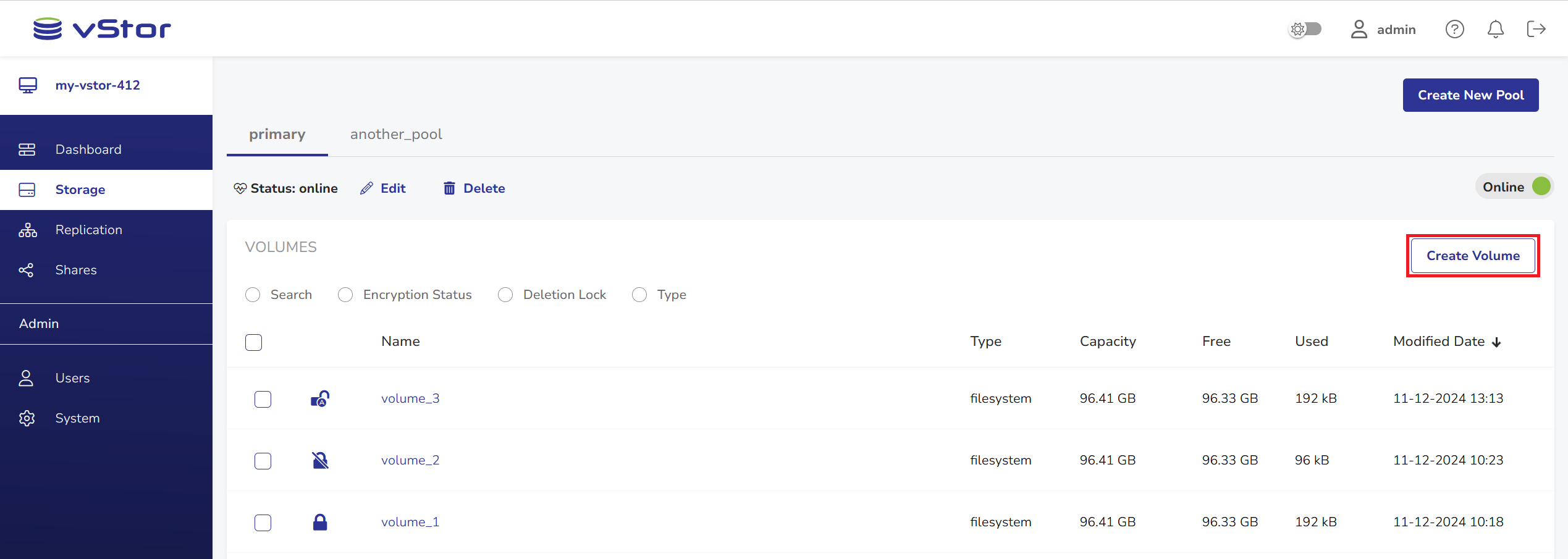 Ensure you can see the new volume in the Volumes table on the Pools screen. If you have enabled the deletion lock, your volume will have a shield icon in the volume view.