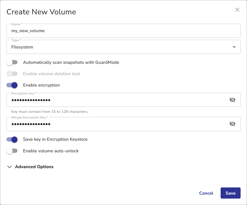 - (Optional) Select the Enable encryption toggle to enable encryption on the volume. Encryption may only be applied to volumes of type Filesystem and Lun. If encryption is enabled, set an encryption password. Optionally, enable Save key in Encryption Keystore to store the password securely.