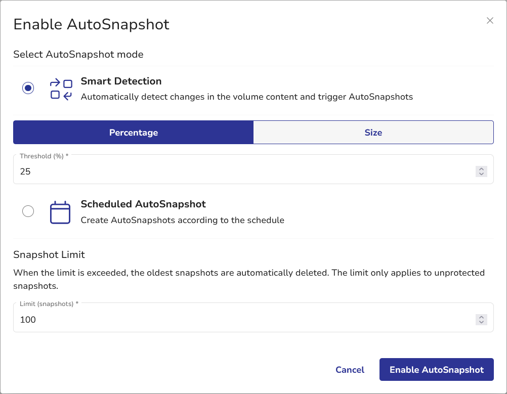 - In the Enable AutoSnapshot dialog, configure the following settings: