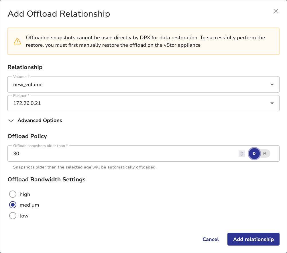 To establish an offload relationship with a secondary vStor, a partnership with this vStor must exist.