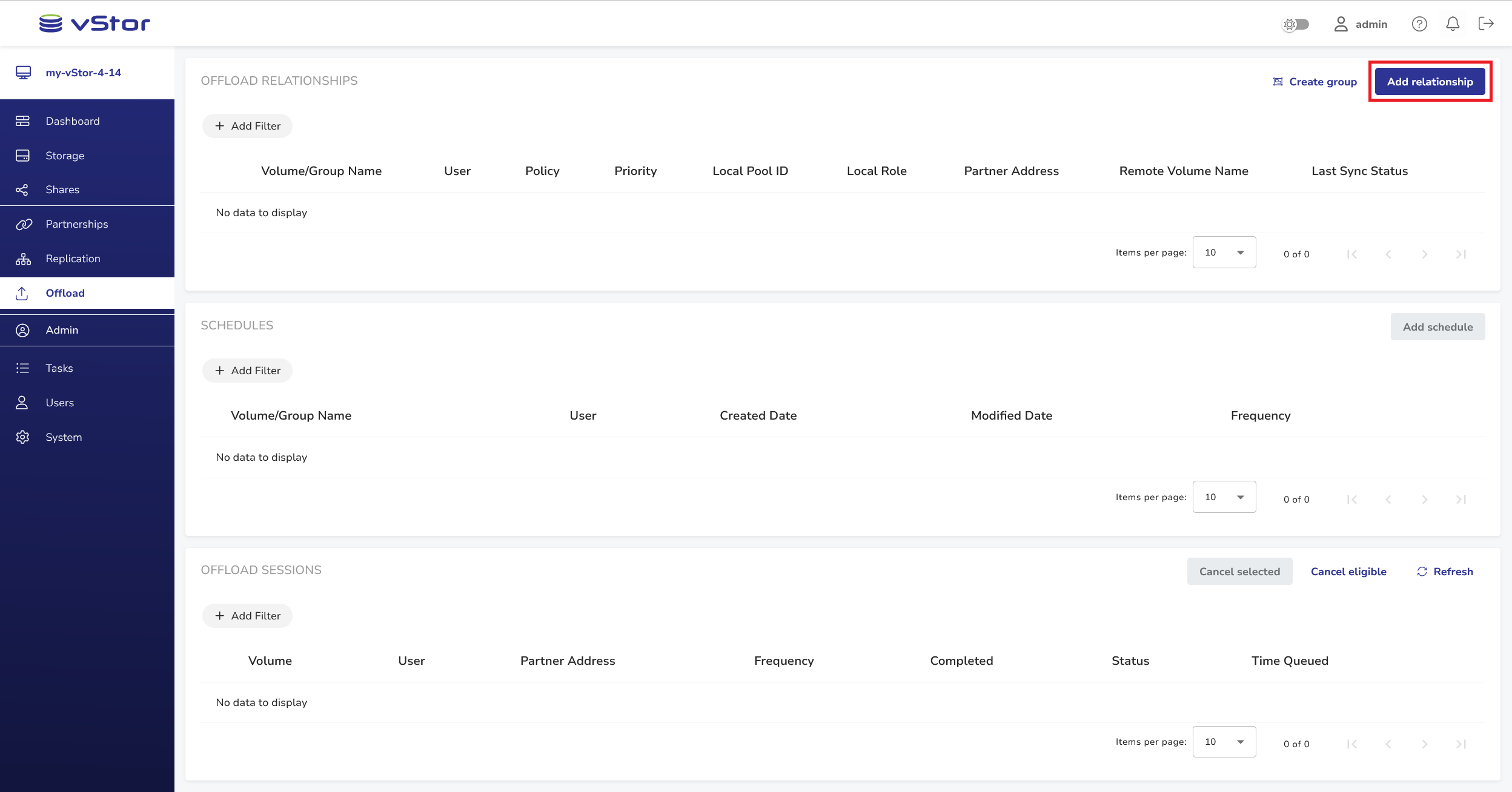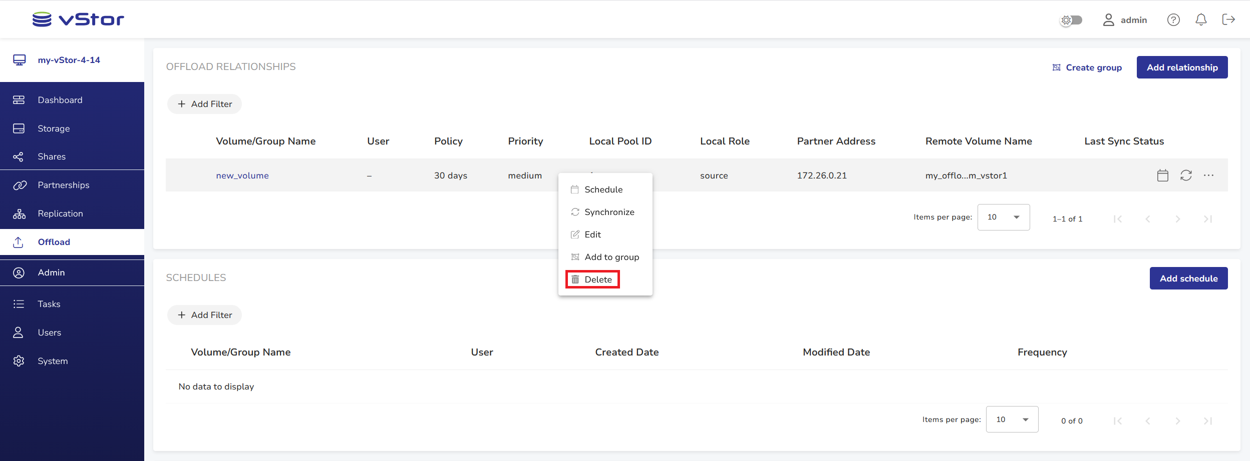 Offloading requires establishing an offload relationship between a volume on the primary vStor (offload source) and a secondary partner vStor (offload target). To establish an offload relationship, you need to create a partnership between two vStors. For more information, see vStor Partnerships.