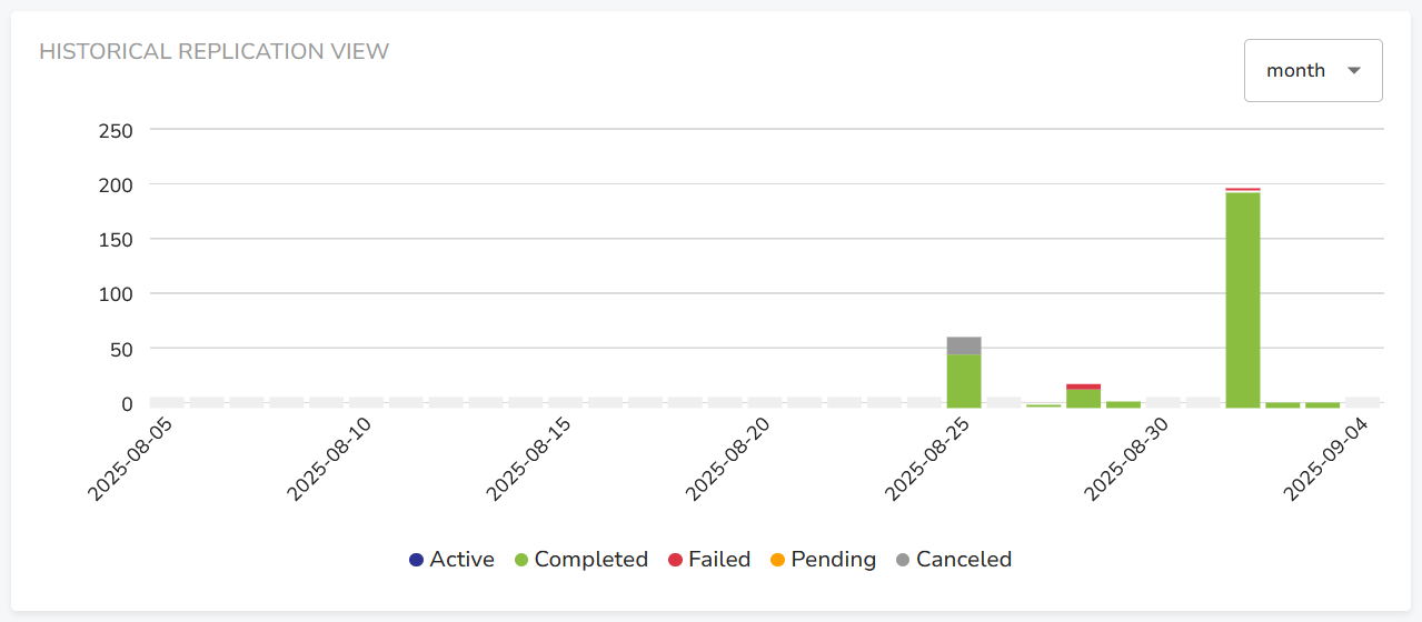 This section shows the replication history over time, within the last day, week or month.