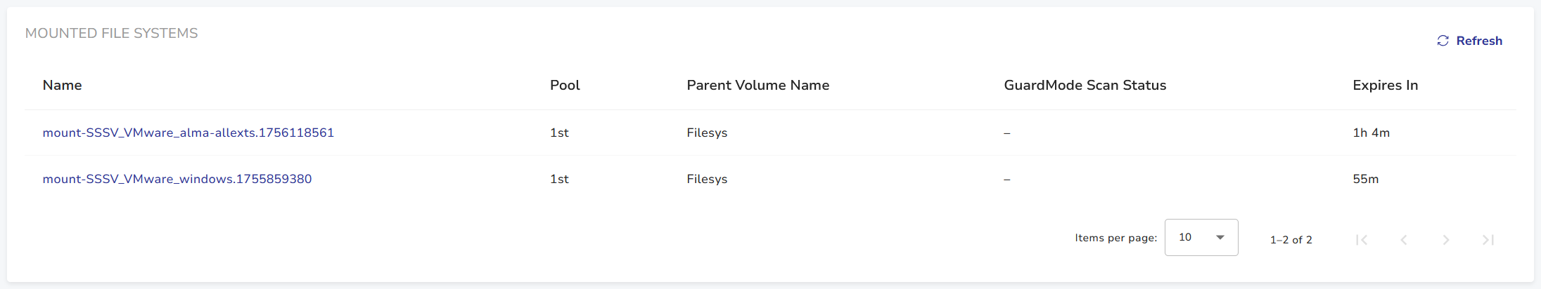 This section displays snapshots mounted for granular file restore and the following information:
