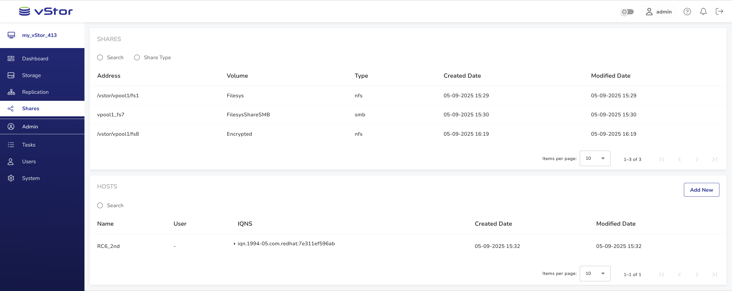 The Shares view displays network shares configured for vStor volumes. Shares are created for Filesystem-type volumes in vStor. When creating a Filesystem volume, you’re prompted to establish a share.